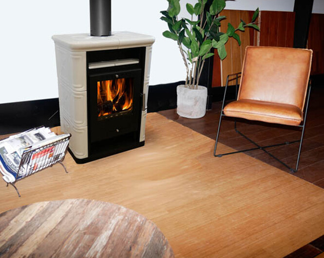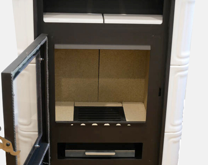 Deze houtkachel met een gewicht van 110KG aan kwalitatief goed ijzer en tegelmateriaal creëert een behaaglijke warmte waarmee een ruimte van 130m3 prima te verwarmen is. Deze kachel heeft een brandbed waarop gestookt wordt, een aslade en een dubbele keerplaat boven de kachel.