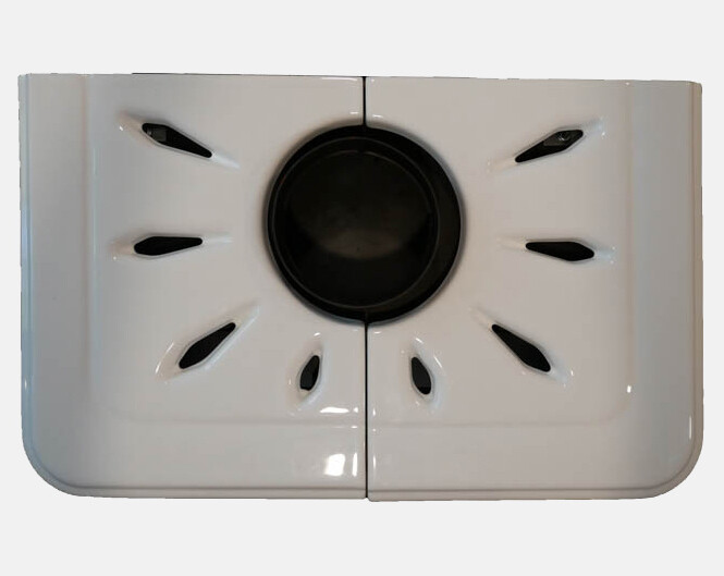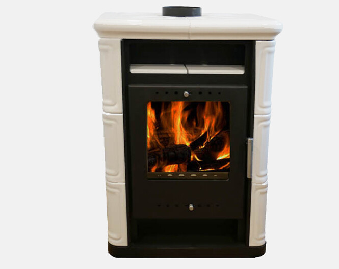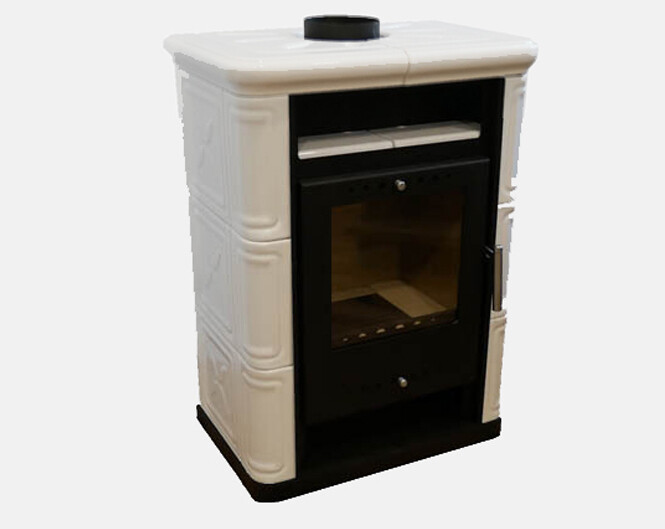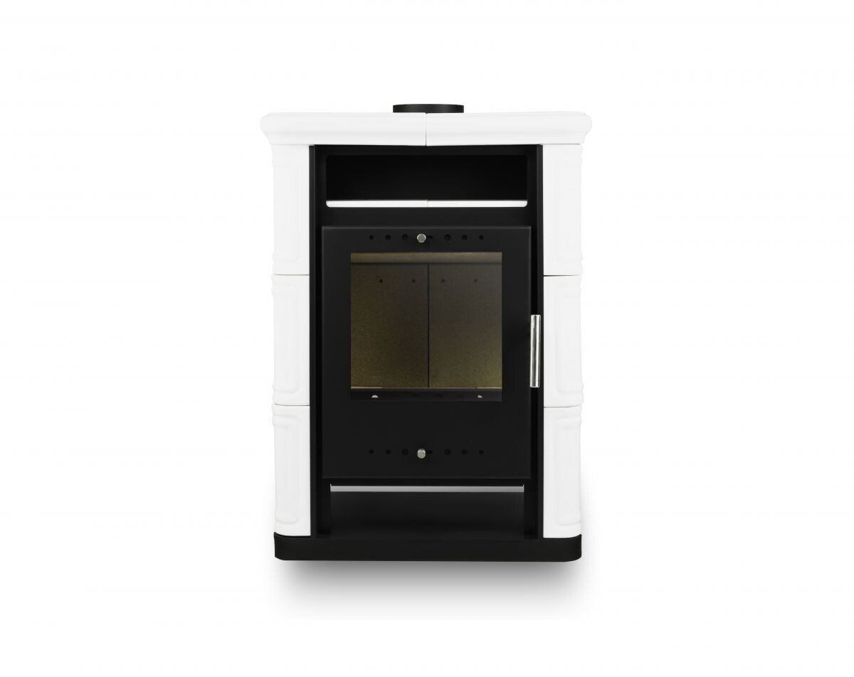 Deze houtkachel heeft enkel een bovenaansluiting. De kachel is bekleed met Witte Keramische Tegels.