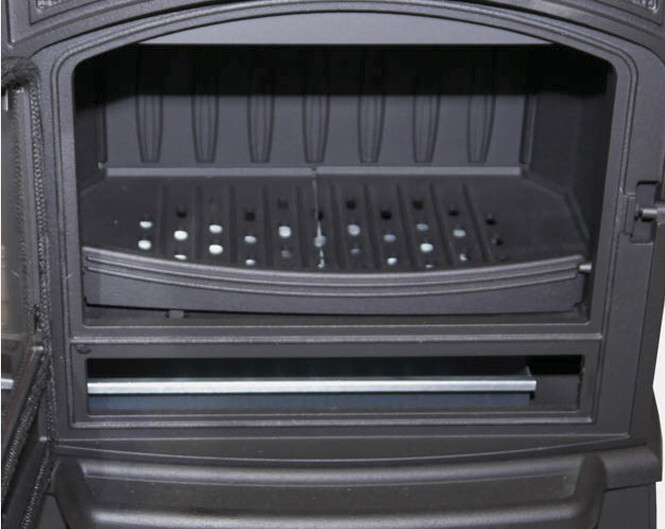 Deze kachel heeft een degelijk brandbed waarop gestookt wordt, een aslade en een keerplaat boven de kachel.