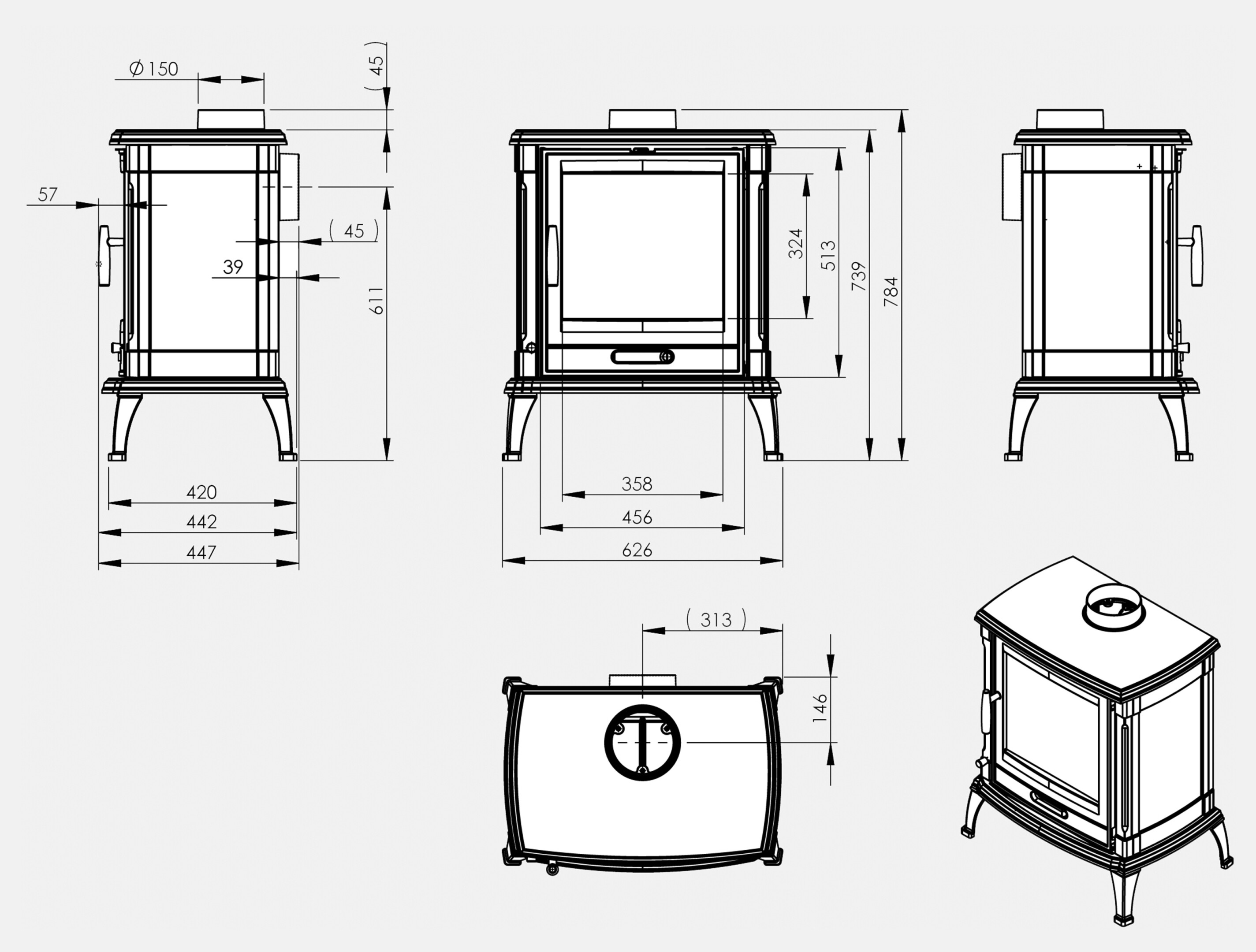 De afmetingen van deze houtkachel zijn:
