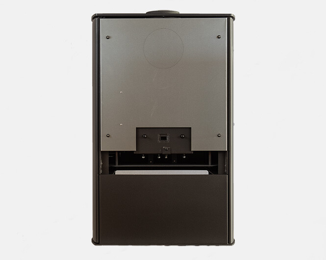 De houtkachel is voorzien van een confectieplaat aan de achterkant voor meer rendement en minder hittestraling naar achteren.