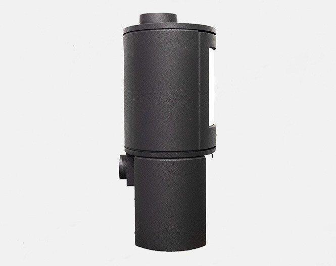 Deze houtkachel heeft een bovenaansluiting en een achteraansluiting.