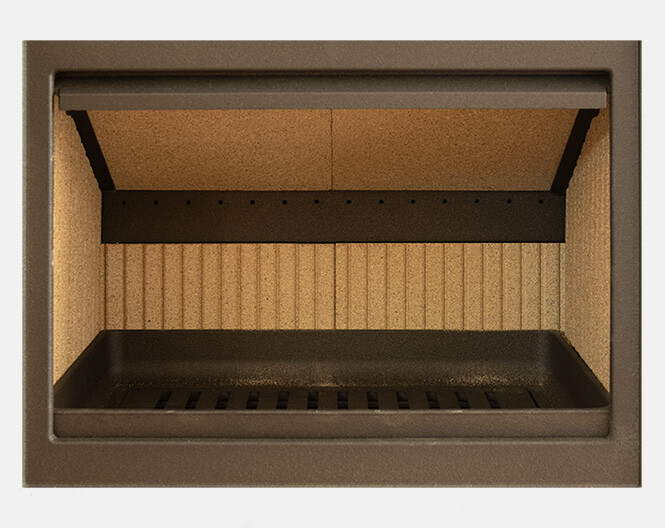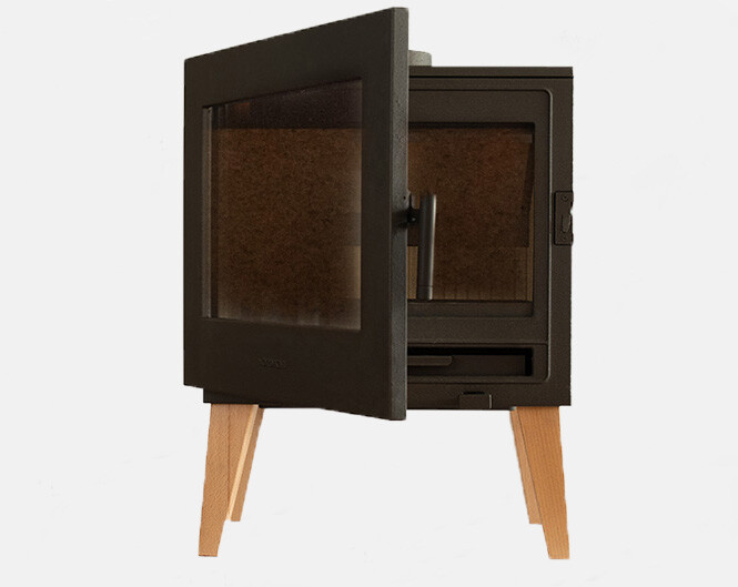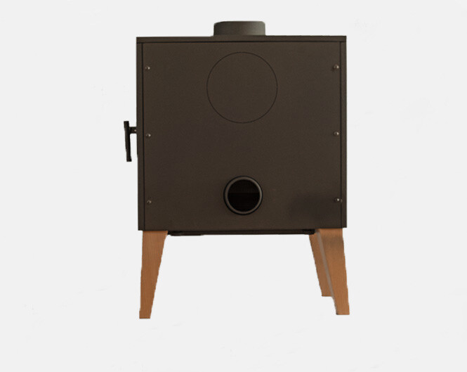 Deze houtkachel heeft zowel een bovenaan- als achtersluiting.