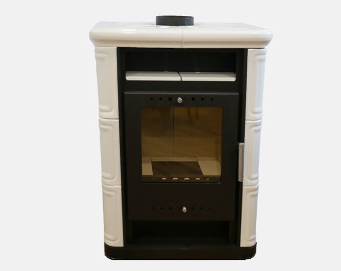 Deze houtkachel heeft enkel een bovenaansluiting. De kachel is bekleed met Witte Keramische Tegels.